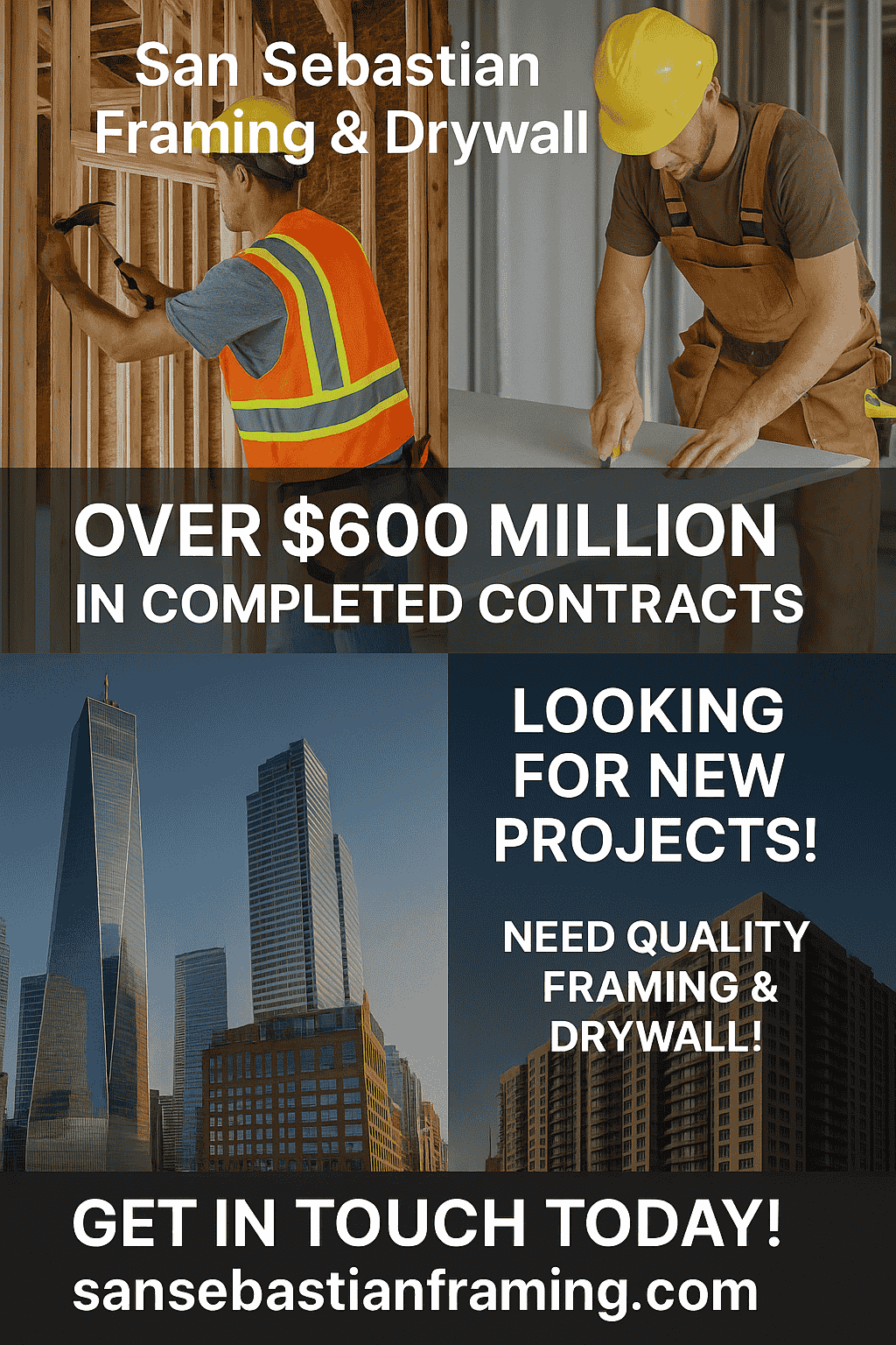 At San Sebastián Framing & Drywall Specialists, we are proud to bring decades of real-world construction experience to your residential, commercial, and multi-family projects. With a proven track record of success throughout New York City’s most dynamic markets — we stand ready to deliver superior craftsmanship, efficient project management, and an unwavering commitment to client satisfaction.
